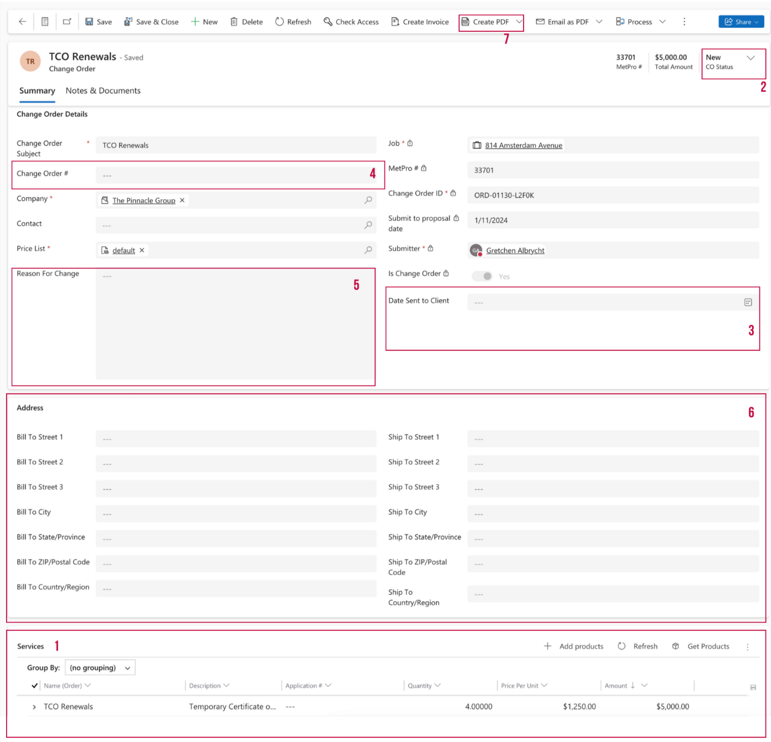 - Submitted = when a Change Order is sent to client; When this option is selected, the Date Sent to Client (#3) AND, the Change Order # (#4) fields become required. In order to save, these additional fields must be completed.