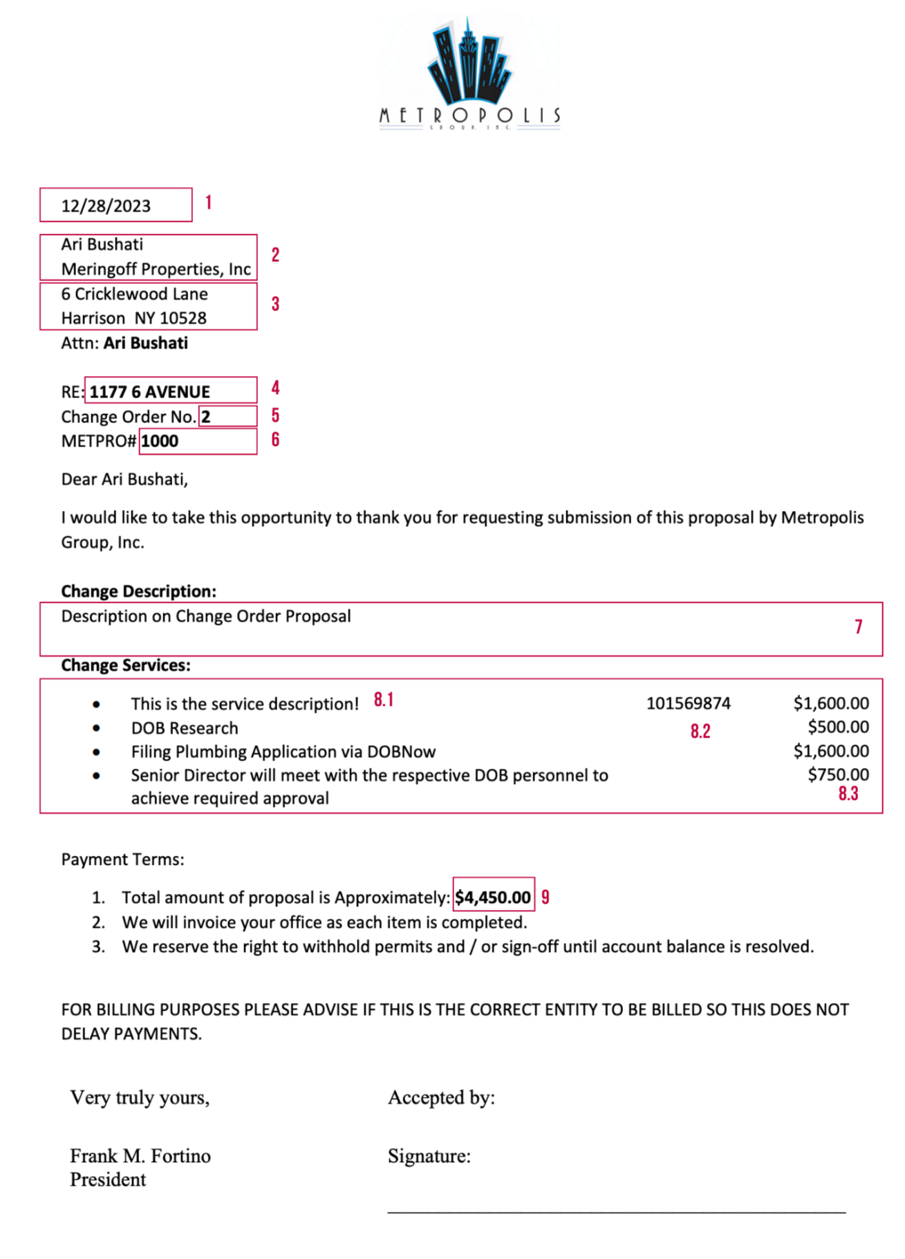 - Create PDF = export PDF of Change order (select Change Order) to send to client via email or DocuSign.