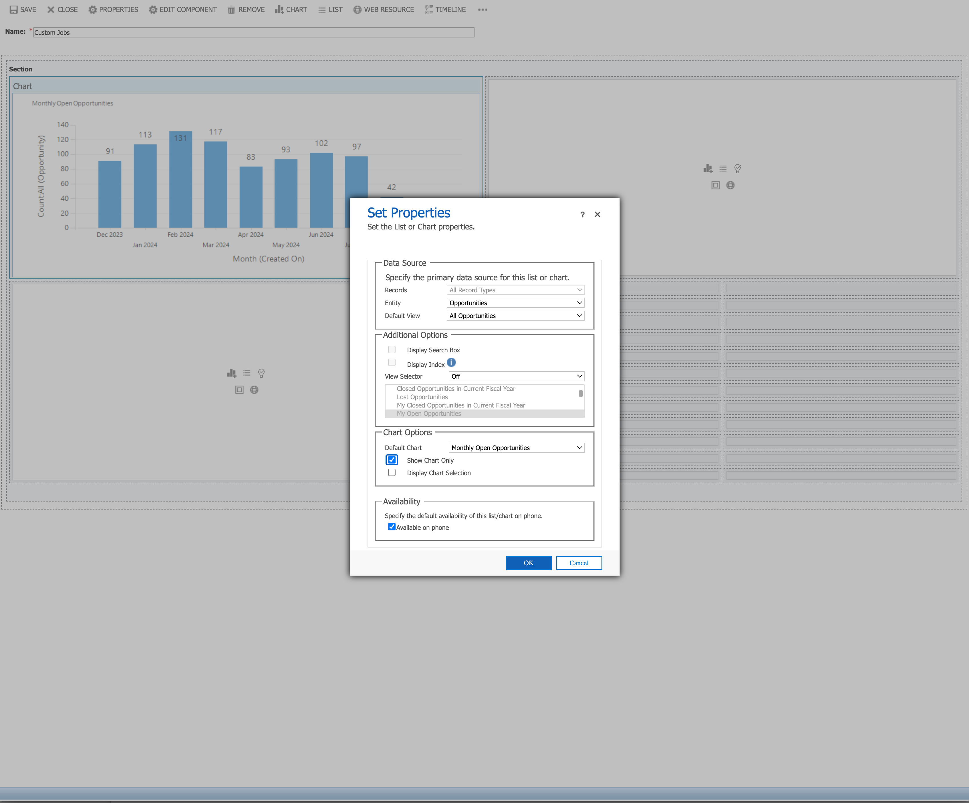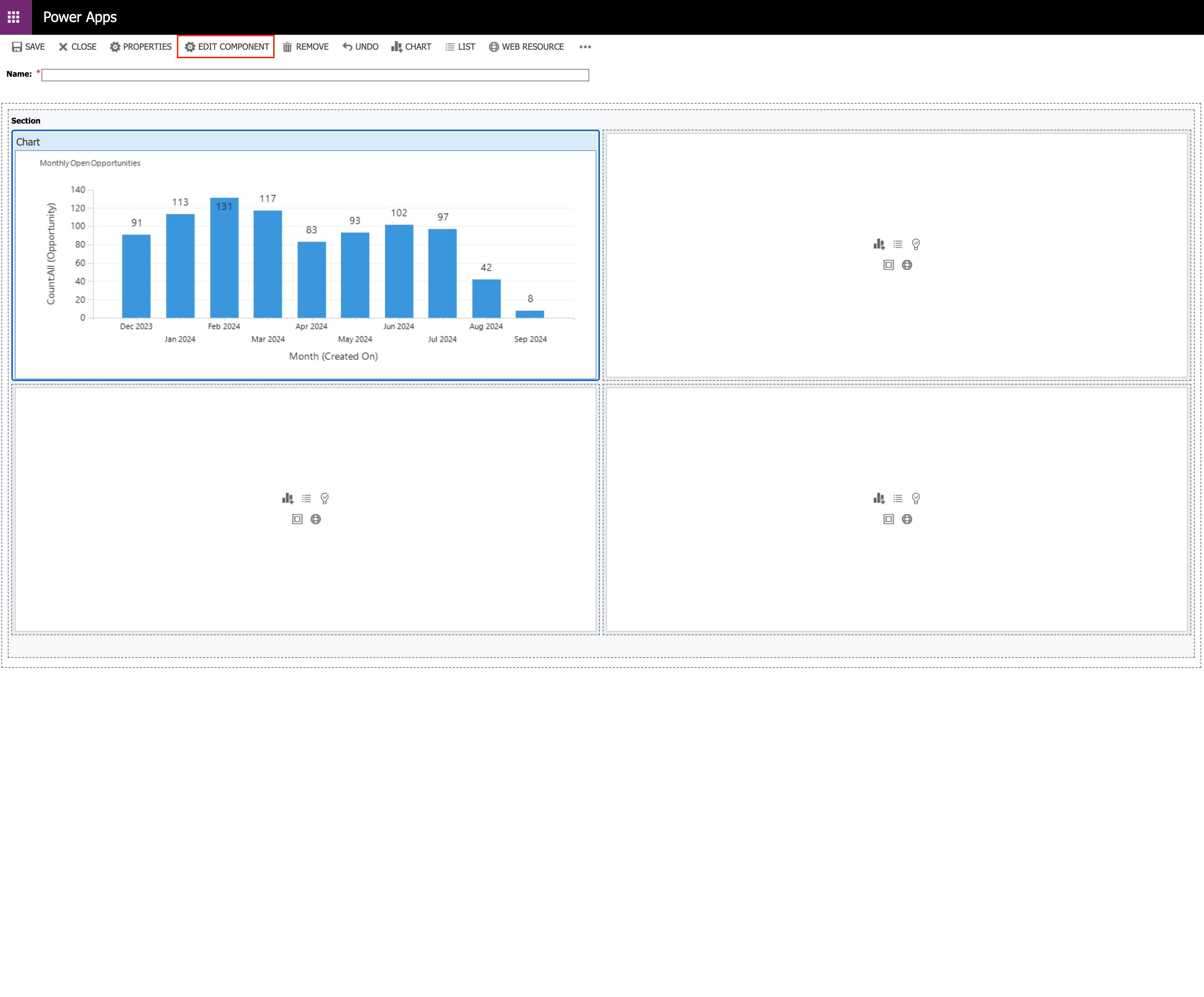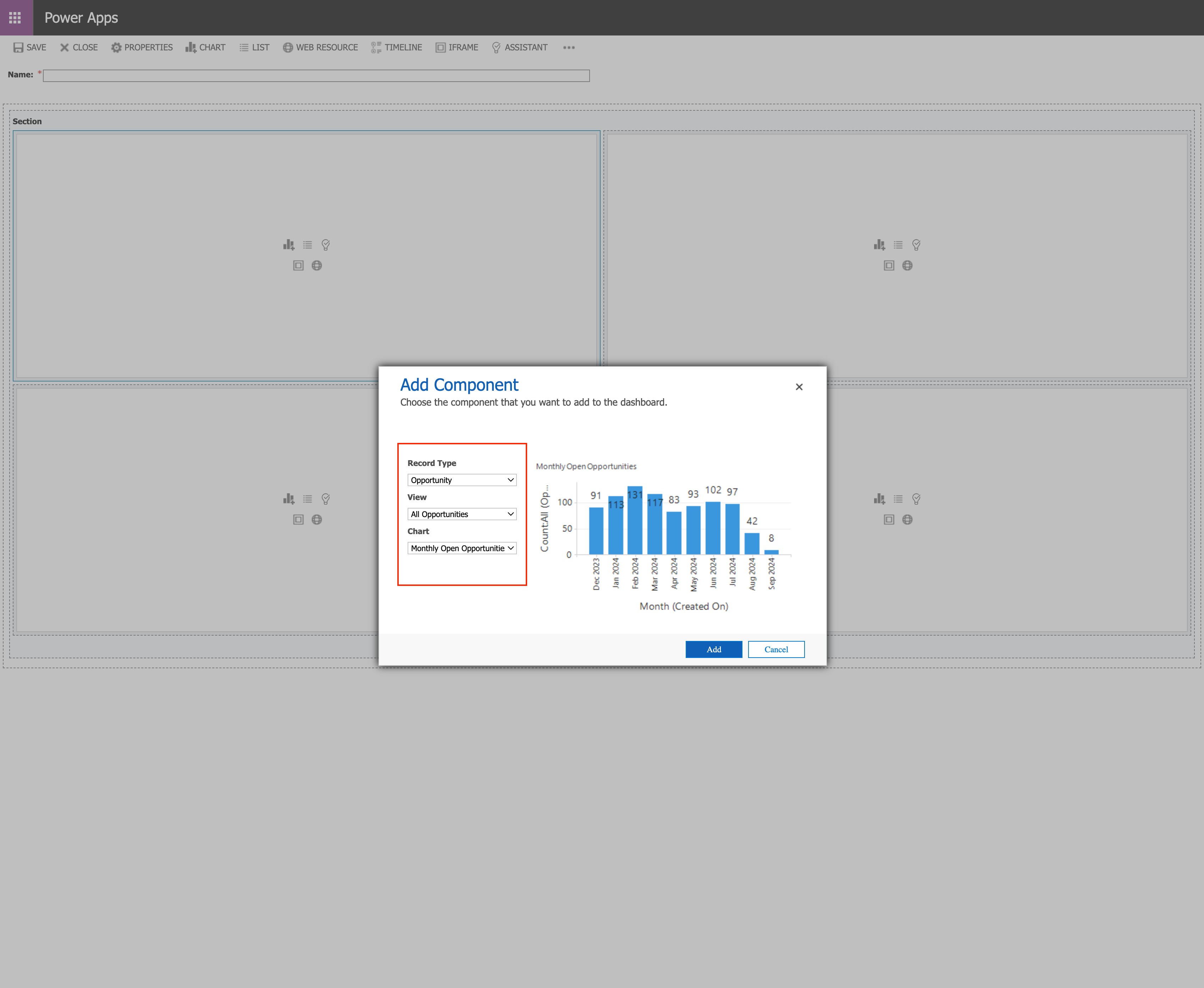 Next click in one of the Sections and start adding/choosing components for the type of line or bar graph, list of line items etc. that you would like displayed