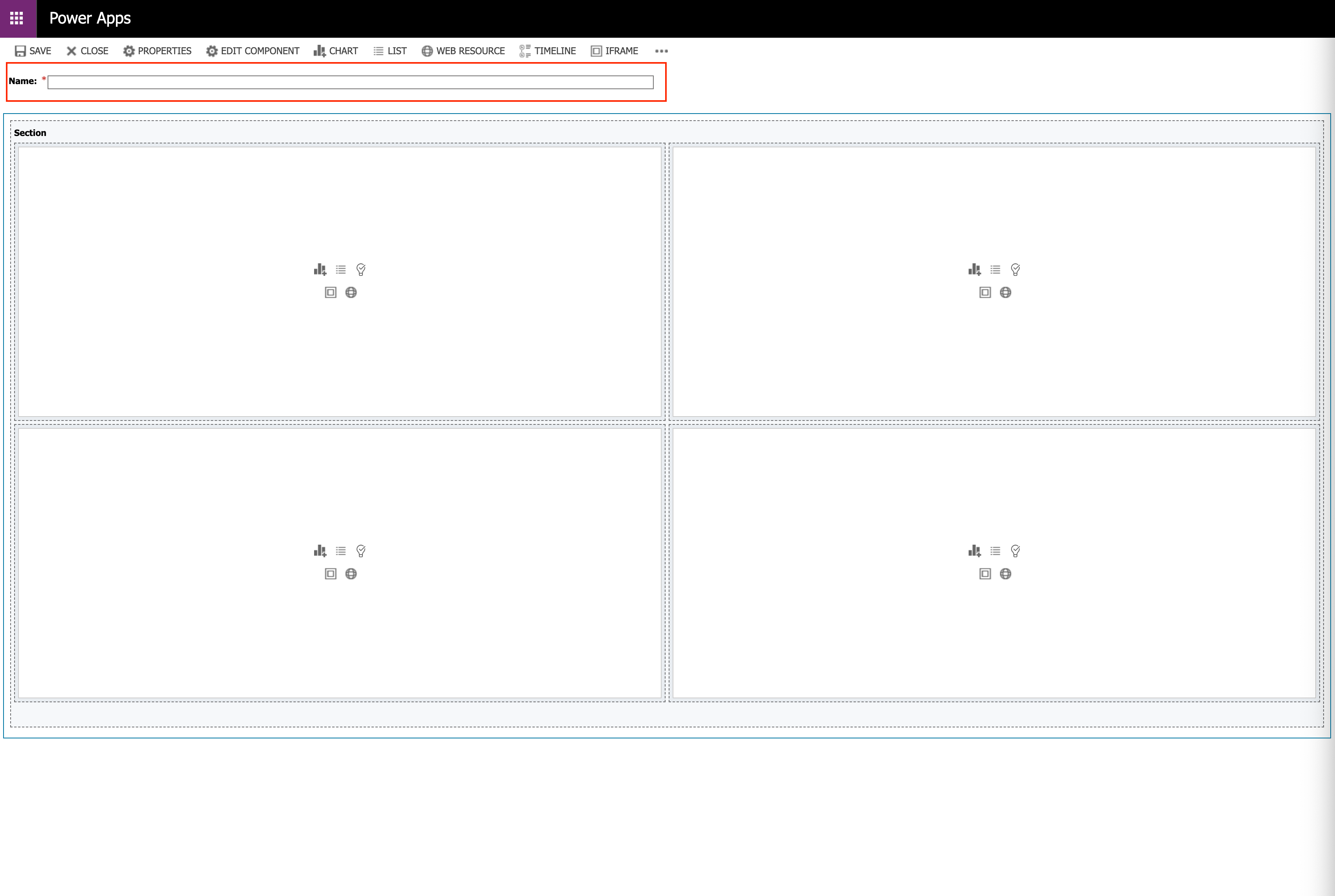 Once you select your layout, the blank layout screen will appear, and you can enter the Name for your custom dashboard